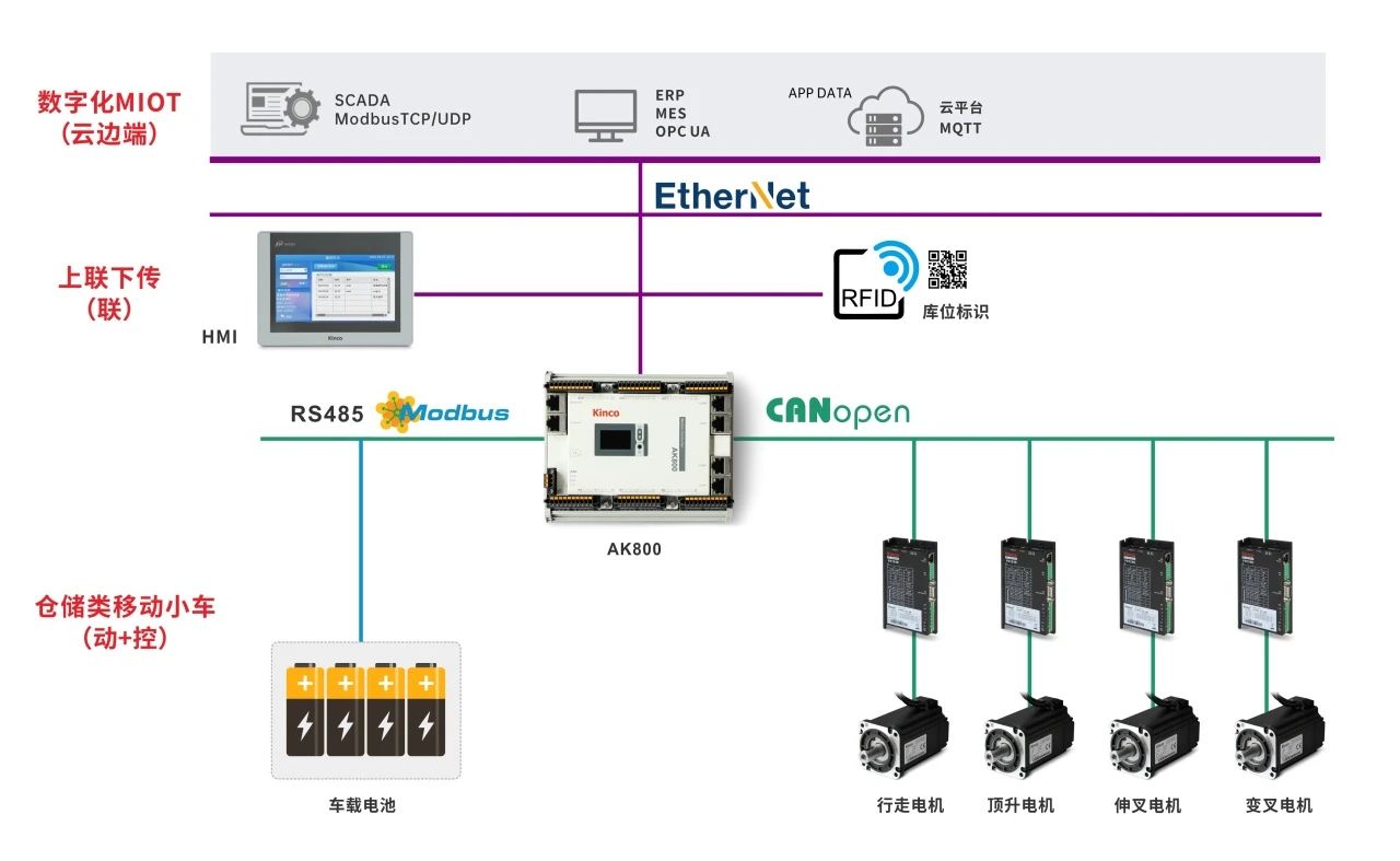 控制器采用CANopen或者EtherCAT總線控制伺服,車輛以及系統狀態信息采集到HMI顯示,步科物聯型HMI支持OPC UA、MQTT、數據庫等多種通訊方式,可通過以太網連接至服務器,為數字化提供基礎數據。